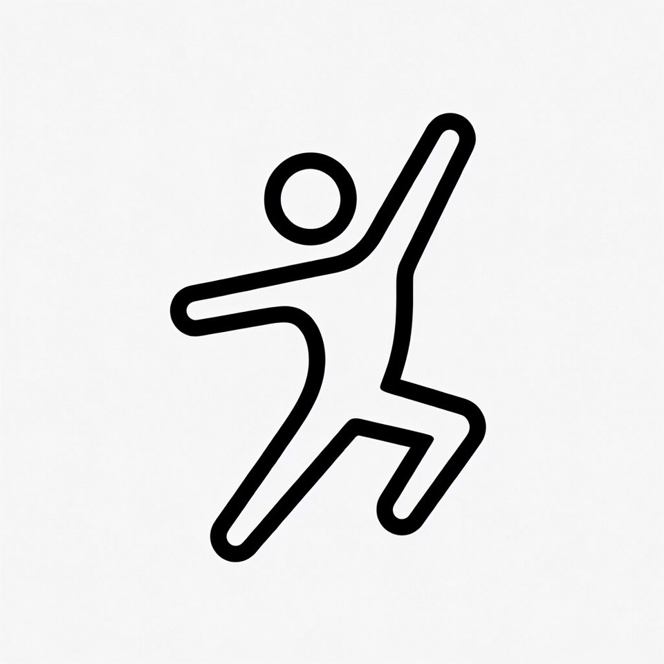 A simple black line drawing of a stick figure person jumping with one arm raised high and legs spread apart. The figure has a round head and basic body outlines on a plain white background. It is an illustration in a minimalist icon style.