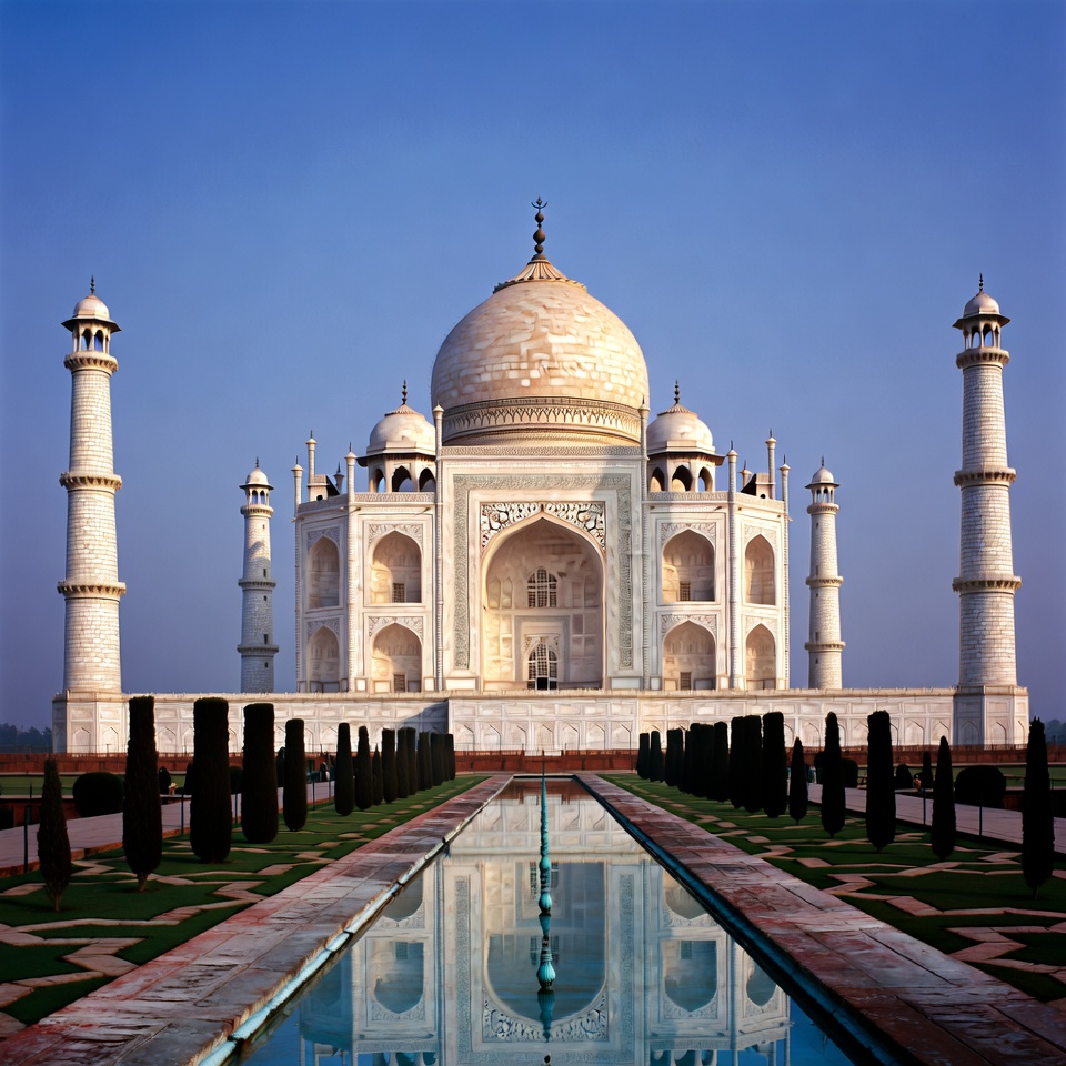 The iconic white marble Taj Mahal stands majestically against a clear blue sky. Its central dome and minarets are perfectly reflected in the long rectangular pool in the foreground. Symmetrical gardens and pathways frame the scene.