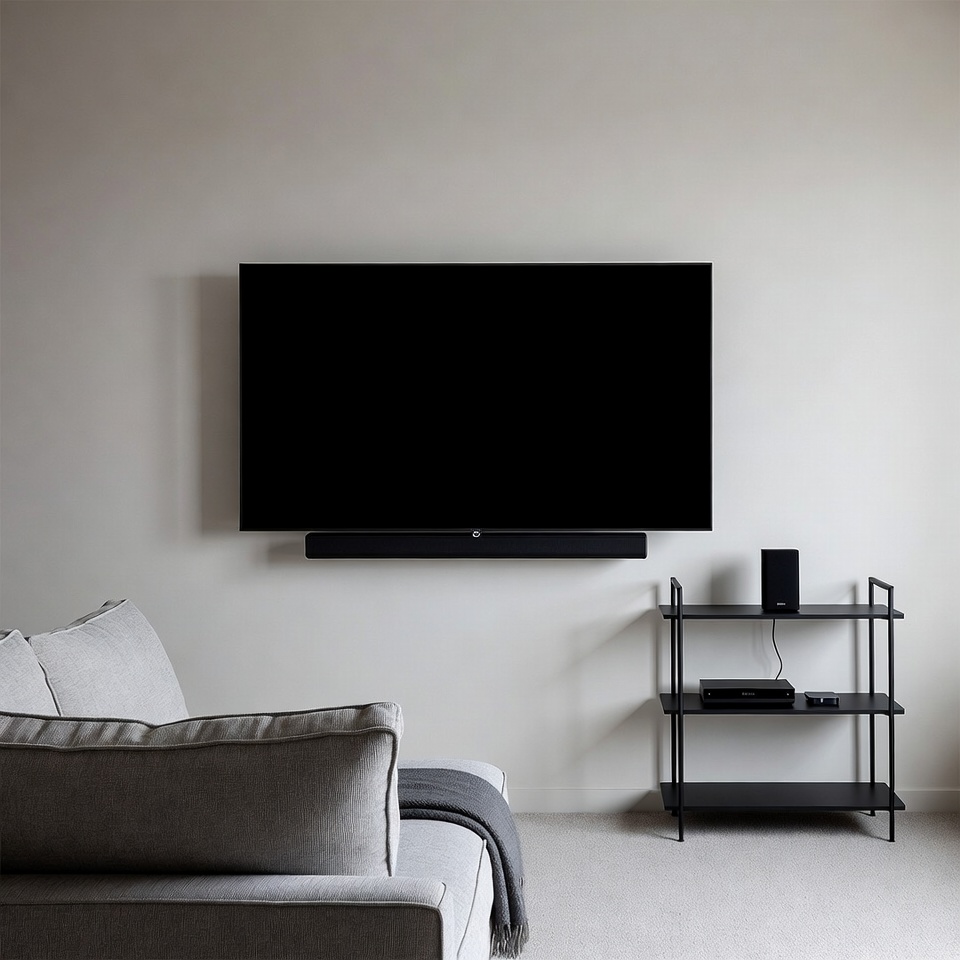 Blu-ray player, beige wall, black shelf, blanket, couch, electronics, flat screen, furniture, gray sofa, home entertainment, interior design, media shelf, modern living room, pillows, soundbar, speaker, television, wall mounted, TV