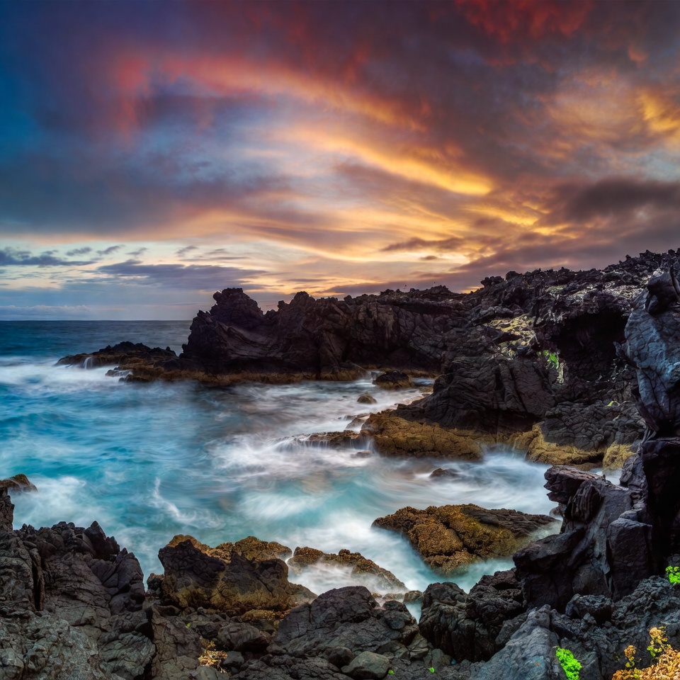 basalt rocks, black rocks, blue ocean, coastal rocks, coastline, dramatic sky, golden hour, horizon, lava rocks, long exposure, nature landscape, ocean waves, orange sky, outdoor scenery, pink clouds, purple sky, rock formations, rugged shore, scenic view, sea spray, seascape, sky colors, tropical coast, turquoise water, volcanic rocks, wave crash, wave motion, sunset