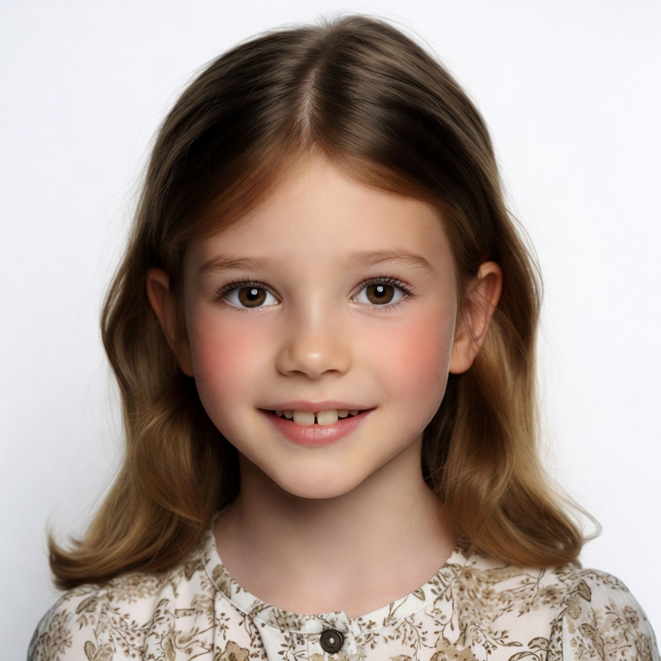 A young girl with shoulder-length wavy brown hair smiles at the camera against a white background. She has fair skin, rosy cheeks, and wears a light-colored floral dress with buttons. Her brown eyes are wide and expressive.