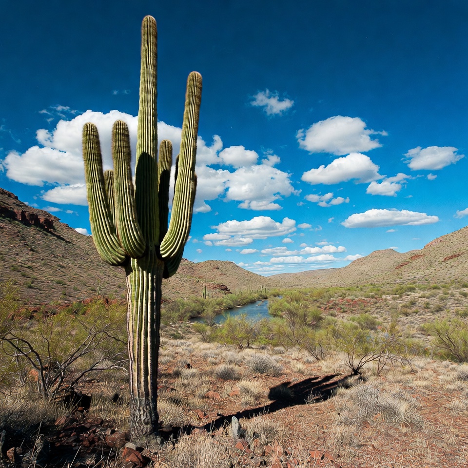A tall saguaro cactus stands prominently in a rocky desert landscape under a clear blue sky with scattered white clouds. A winding river flows through the green valley surrounded by red rock hills and sparse vegetation. The cactus casts a long shadow on the dry, reddish ground.