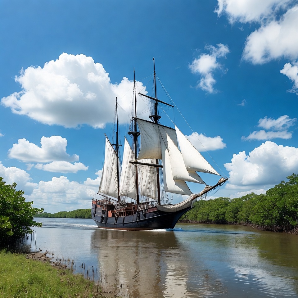A traditional wooden sailing ship with three masts and white sails navigates down a calm river. The dark hull contrasts against the clear blue sky dotted with white clouds. Lush green mangroves line the riverbanks on both sides.