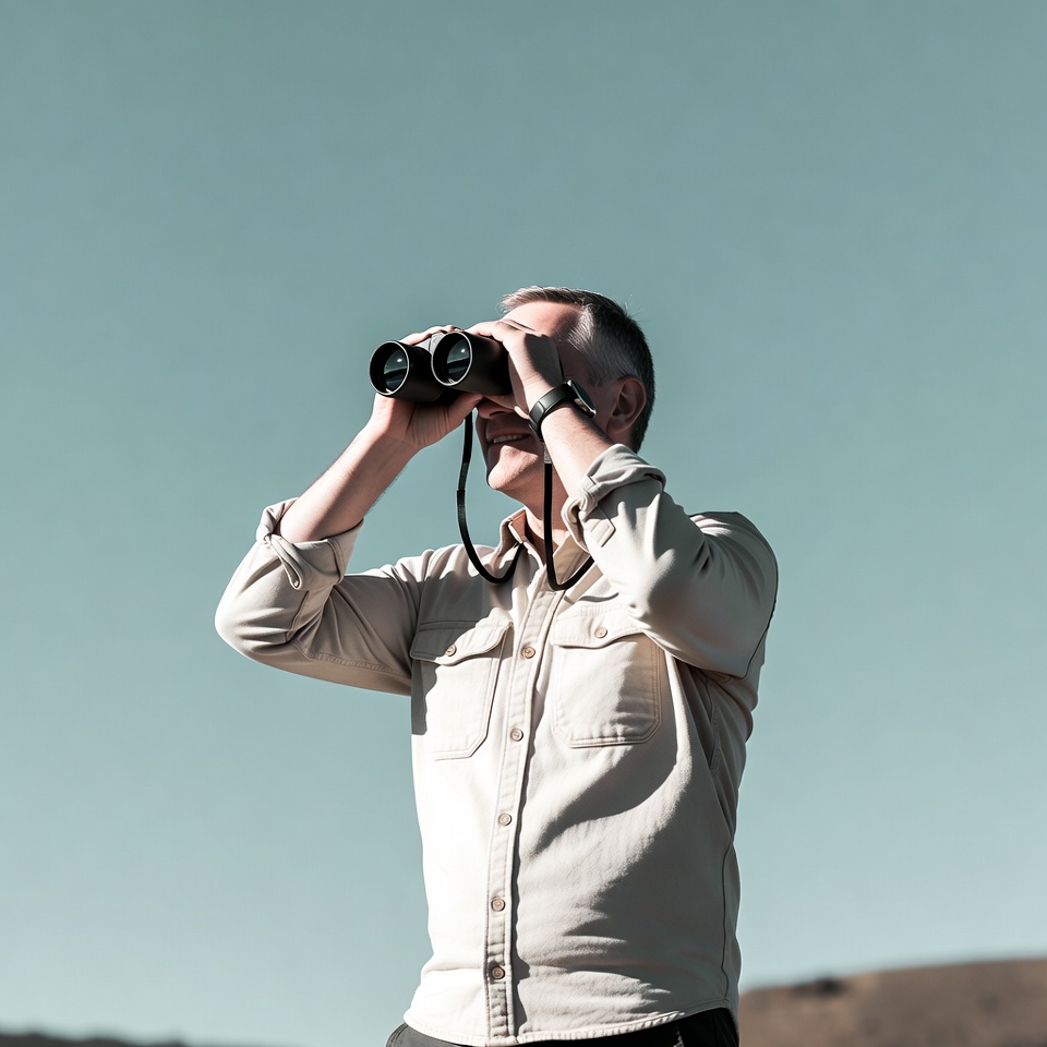 A middle-aged White man with short graying hair looks through black binoculars held to his eyes. He wears a light beige button-up shirt with rolled sleeves and khaki pants, standing against a clear blue sky and distant brown hills. A watch is visible on his left wrist and the binocular strap hangs around his neck.