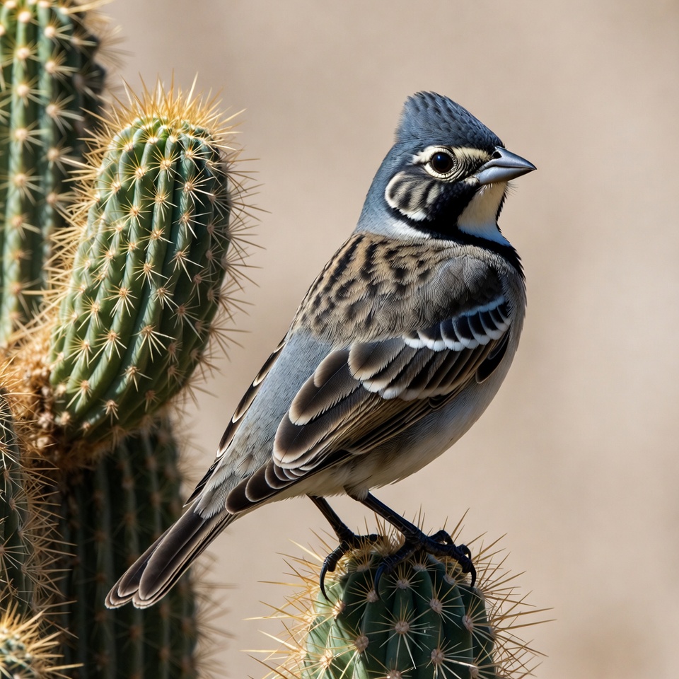 A lark sparrow with blue-gray head, white eye stripes, and streaked brown wings perches on a tall saguaro cactus. The bird's white throat and underparts contrast with the green spiny cactus arms. The background is a warm beige desert tone.