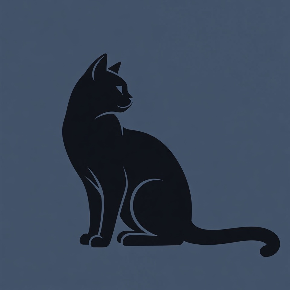A black silhouette of a cat sits in profile against a dark blue background. The cat has pointed ears, a curved tail, and a sleek outline. It is depicted in a simple vector illustration style.