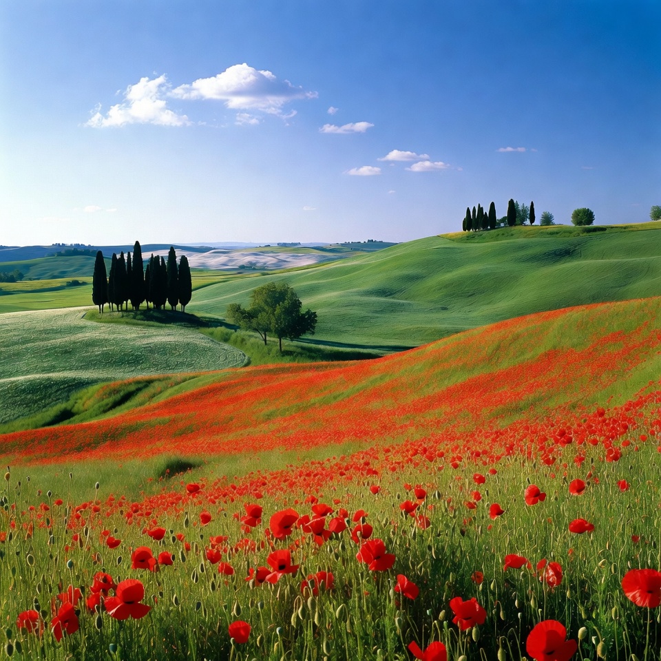 Italian countryside, Tuscany landscape, Val d'Orcia, blue sky, cypress trees, distant hills, farmland, grassy hills, green fields, hilltop trees, nature scenery, poppies blooming, red poppies, rolling hills, rural Italy, scenic view, vibrant flowers, white clouds, wildflowers, poppy field