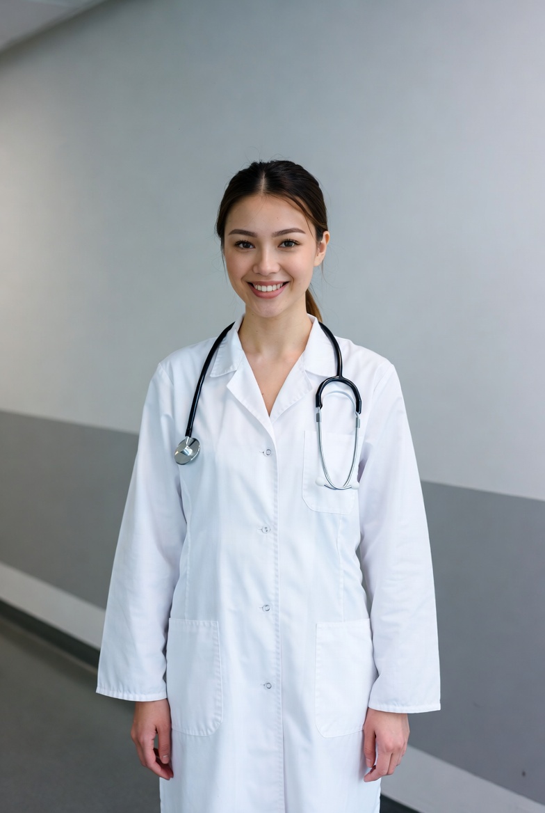 A young Asian woman wearing a white lab coat and stethoscope stands smiling in a hospital hallway. She has dark hair tied in a ponytail and stands confidently against a gray wall. The setting features tiled floors and medical environment.