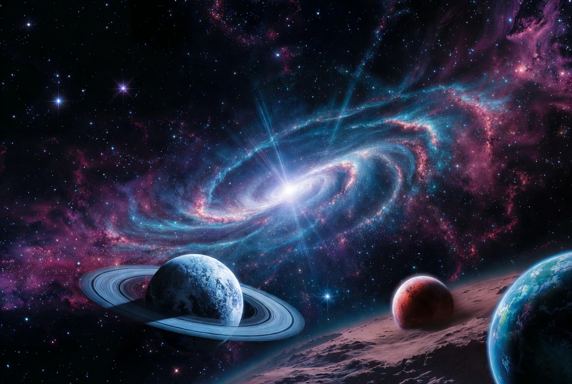 A stunning digital illustration of a bright spiral galaxy with swirling purple and blue arms dominates the cosmic scene. Nearby float a ringed Saturn-like planet, a blue planet, a red planet, and Earth-like globe against a starry black space background. Glowing stars and nebulae add vivid colors to the universe.