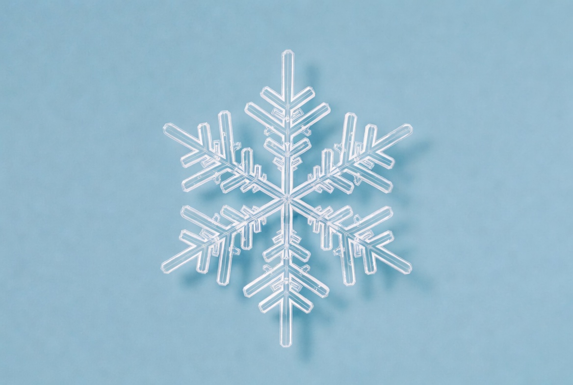 A delicate white snowflake with intricate symmetrical branches is centered against a solid light blue background. The snowflake appears translucent with subtle shadows, creating a floating effect. It features six distinct arms with fine, pointed details.
