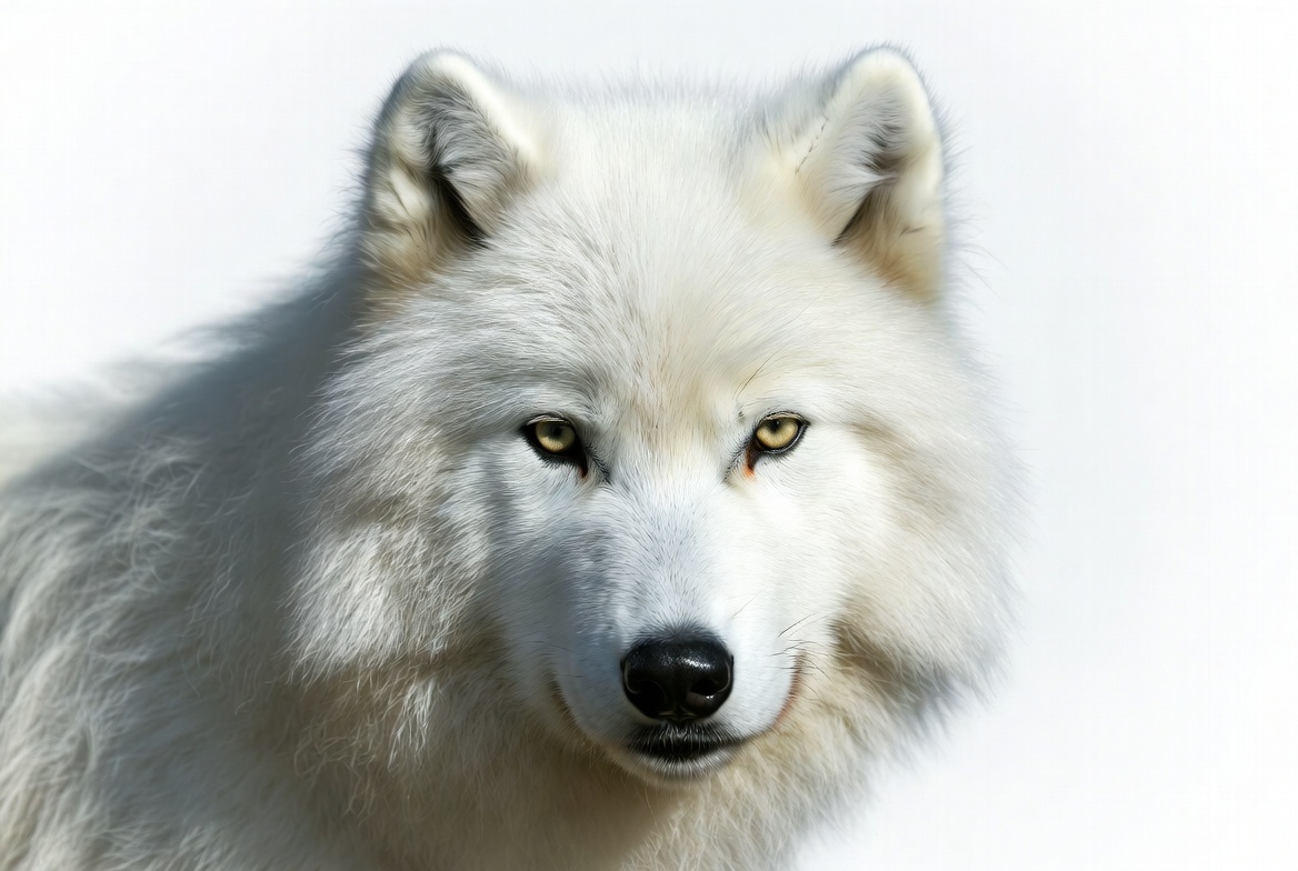animal, arctic wolf, black nose, canine, close-up, ears, fluffy fur, fur, headshot, isolated background, muzzle, portrait, predator, stare, white background, wild animal, wildlife, wolf, yellow eyes, white wolf