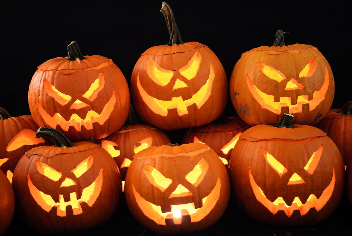 A cluster of carved jack-o'-lantern pumpkins with glowing orange faces is arranged in a pile. Each pumpkin features jagged teeth, triangular eyes, and menacing expressions illuminated from within. They are set against a solid black background.
