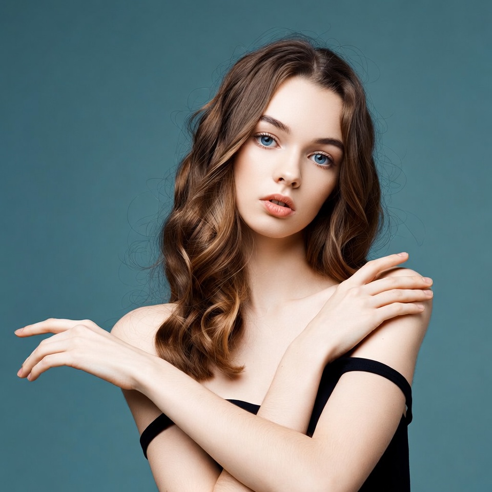 White, beautiful woman, black top, blue background, blue eyes, brown hair, crossed arms, female, hands on shoulders, long hair, model pose, off-shoulder top, portrait, pretty girl, serious expression, wavy hair, young woman, woman
