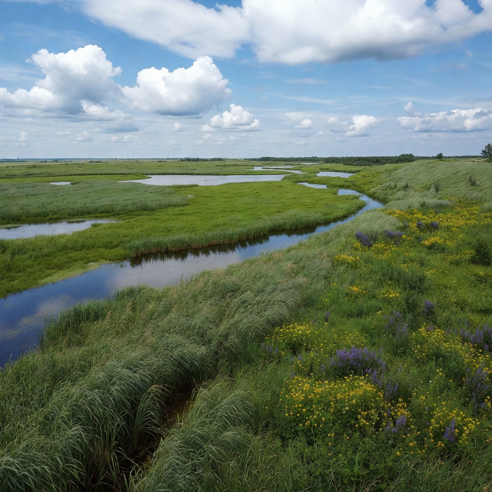 A serene landscape features a winding brown river cutting through expansive green wetlands under a bright blue sky with fluffy white clouds. Tall green grasses and patches of yellow and purple wildflowers line the riverbanks. The scene stretches to distant grassy horizons with scattered small ponds.