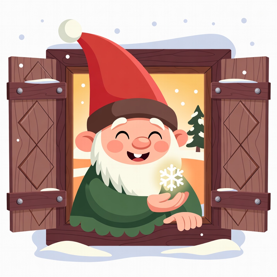 A cheerful cartoon gnome with a red hat and white beard leans out of wooden shutters, holding a glowing snowflake. Snow falls outside the window with a pine tree in a snowy landscape. The illustration features vibrant colors and a festive winter theme.