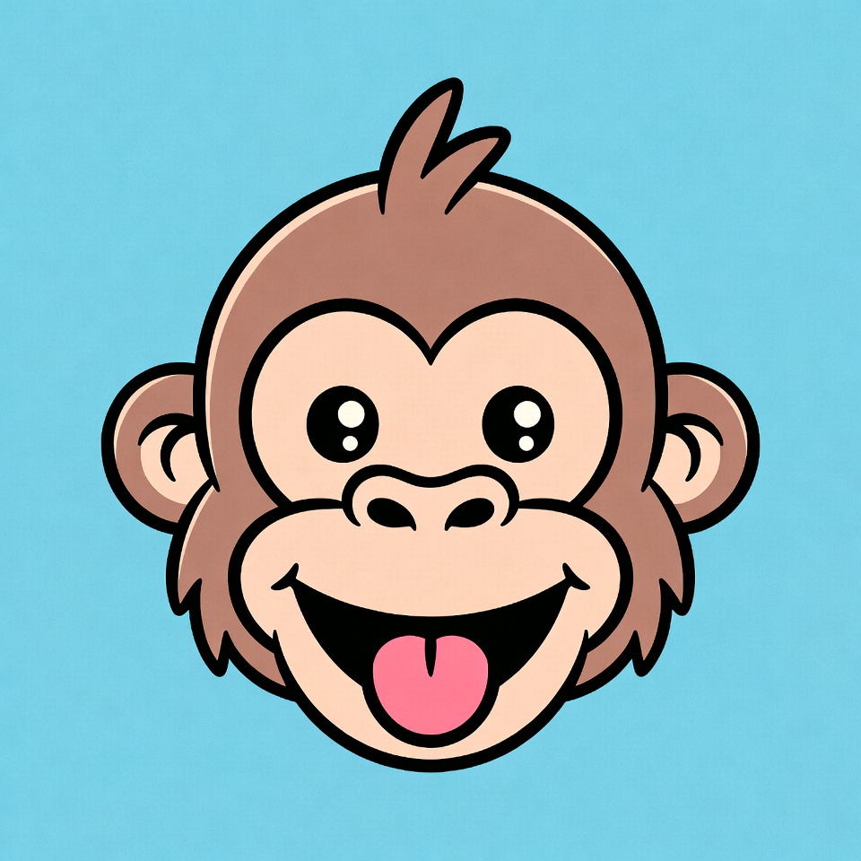 A cute cartoon monkey with brown fur and big sparkling eyes smiles widely with its tongue out. It features a simple outlined style with tufted hair on top and fluffy ears. The illustration is isolated on a solid light blue background.