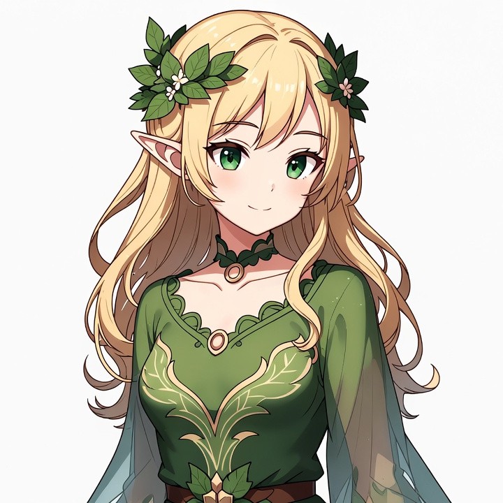 An anime-style illustration of a young elf girl with long blonde hair, pointed ears, and green eyes. She wears a green dress adorned with leaf patterns and a matching leaf crown with white flowers. She smiles gently against an isolated background.