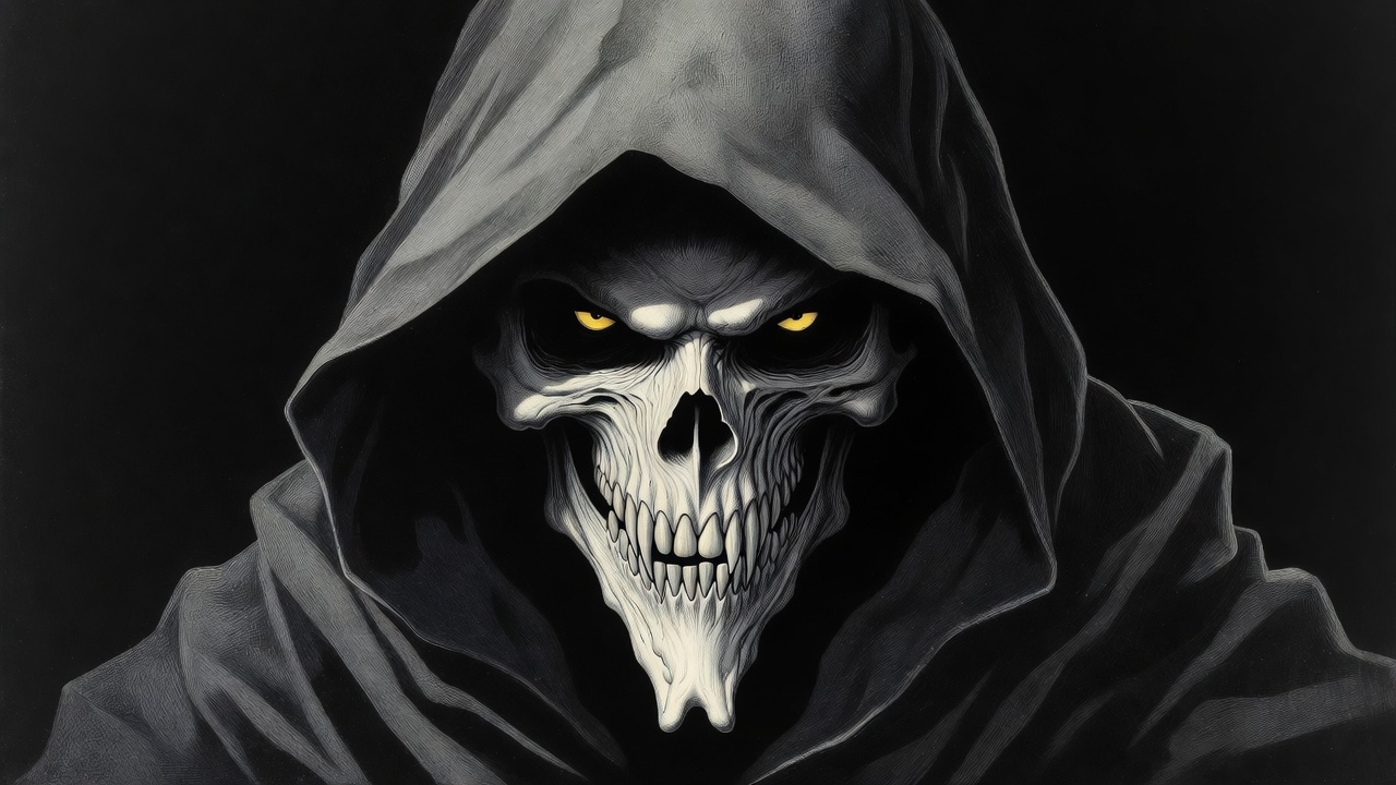 A digital illustration features a menacing white skull with glowing yellow eyes and sharp teeth, shrouded in a dark gray hood. The skull stares directly forward against a solid black background. The artwork has a dramatic, high-contrast style with glowing highlights on the eyes and teeth.