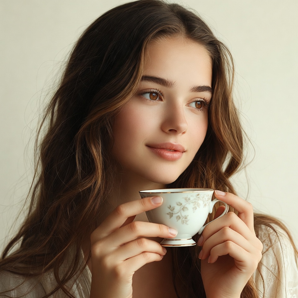 A young woman with long wavy brown hair holds a delicate porcelain teacup with both hands. She has soft facial features, brown eyes, and pink lips, gazing slightly to the side. She wears a light-colored blouse against a plain beige background.