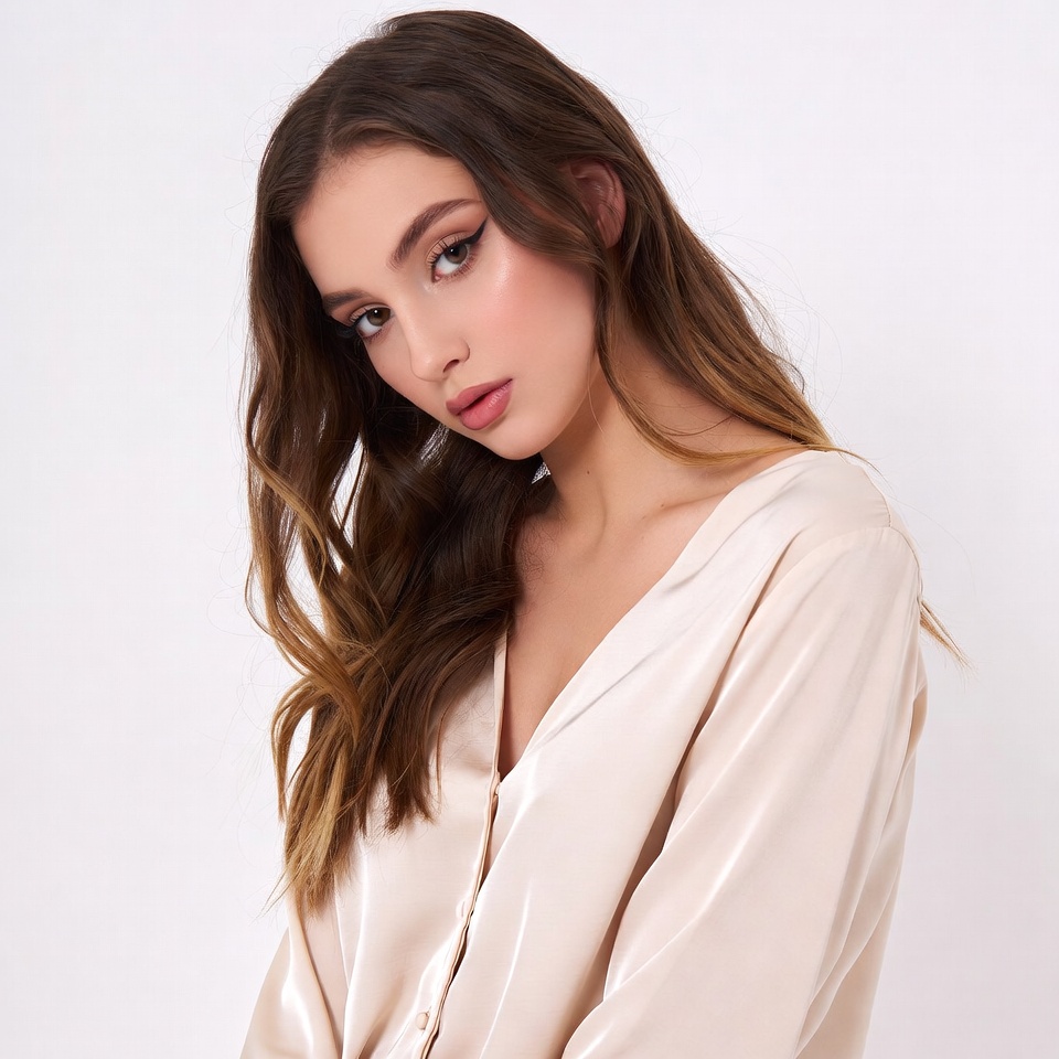 A young woman with long wavy brown hair poses for a close-up portrait against a white background. She wears a shiny beige silk blouse with a deep V-neckline and has subtle makeup with eyeliner and pink lips. Her head is turned slightly to the side, highlighting her facial features.