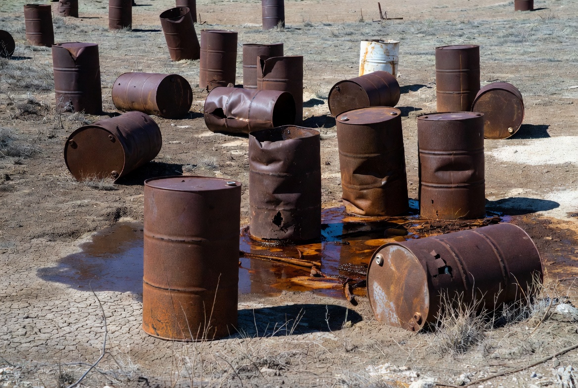 Numerous rusty metal oil drums are scattered across a dry, sandy desert ground. Some drums are upright, others tipped over, with orange rust stains and liquid spills on the pale soil. Sparse dry grass and distant barrels extend into the barren landscape.