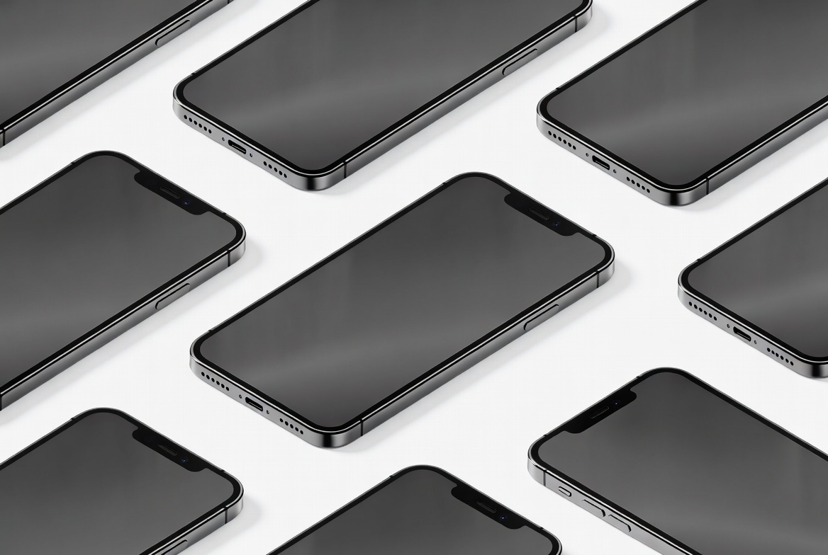 angled phones, black phones, blank screens, cellular, device, gadget, glossy finish, iPhone, isolated, mobile phones, modern phones, multiple phones, phone mockup, smartphone collection, technology, top view, white background, smartphones