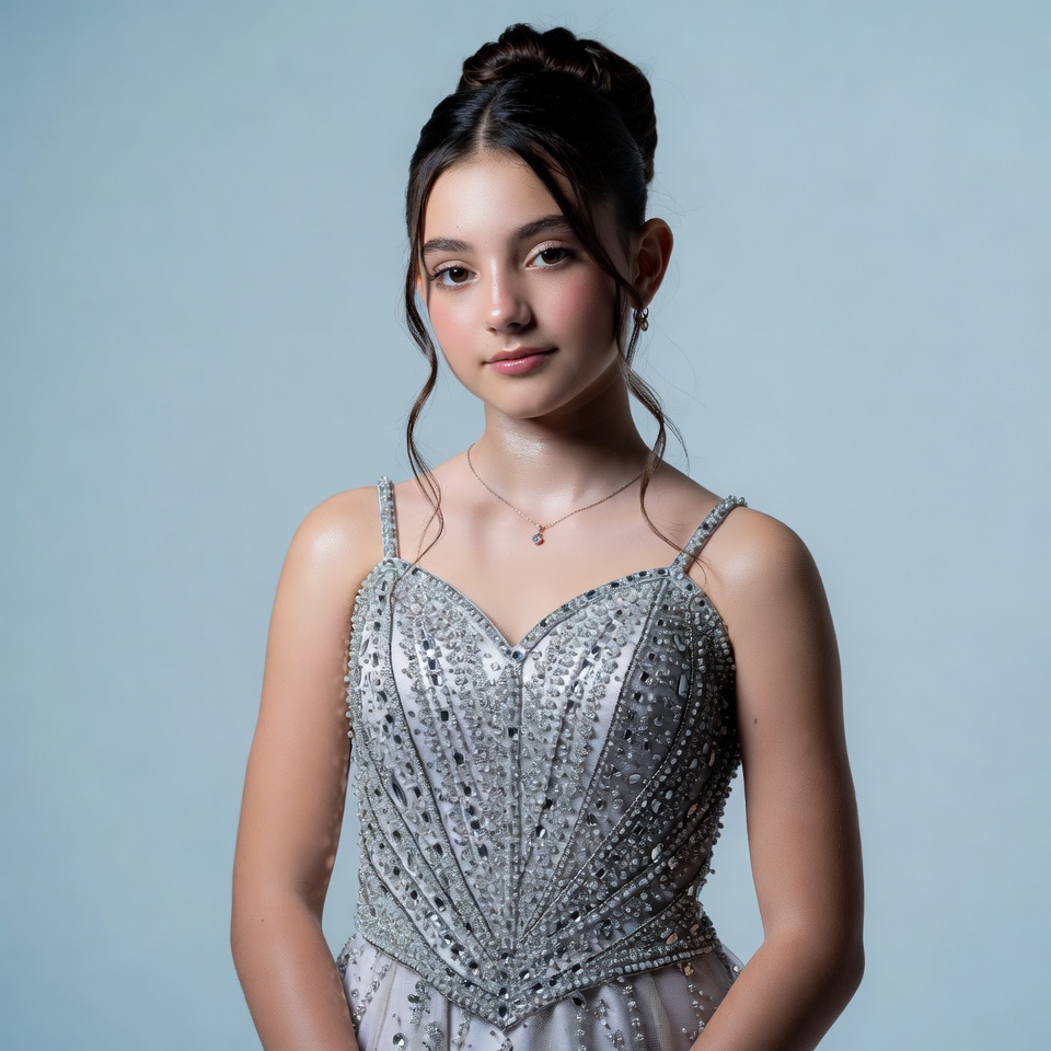 A young girl with dark hair styled in an elegant updo stands against a blue background. She wears a shimmering silver beaded dress with thin straps and a heart-shaped neckline, along with a delicate necklace and earrings. She poses gracefully with her hands clasped in front.