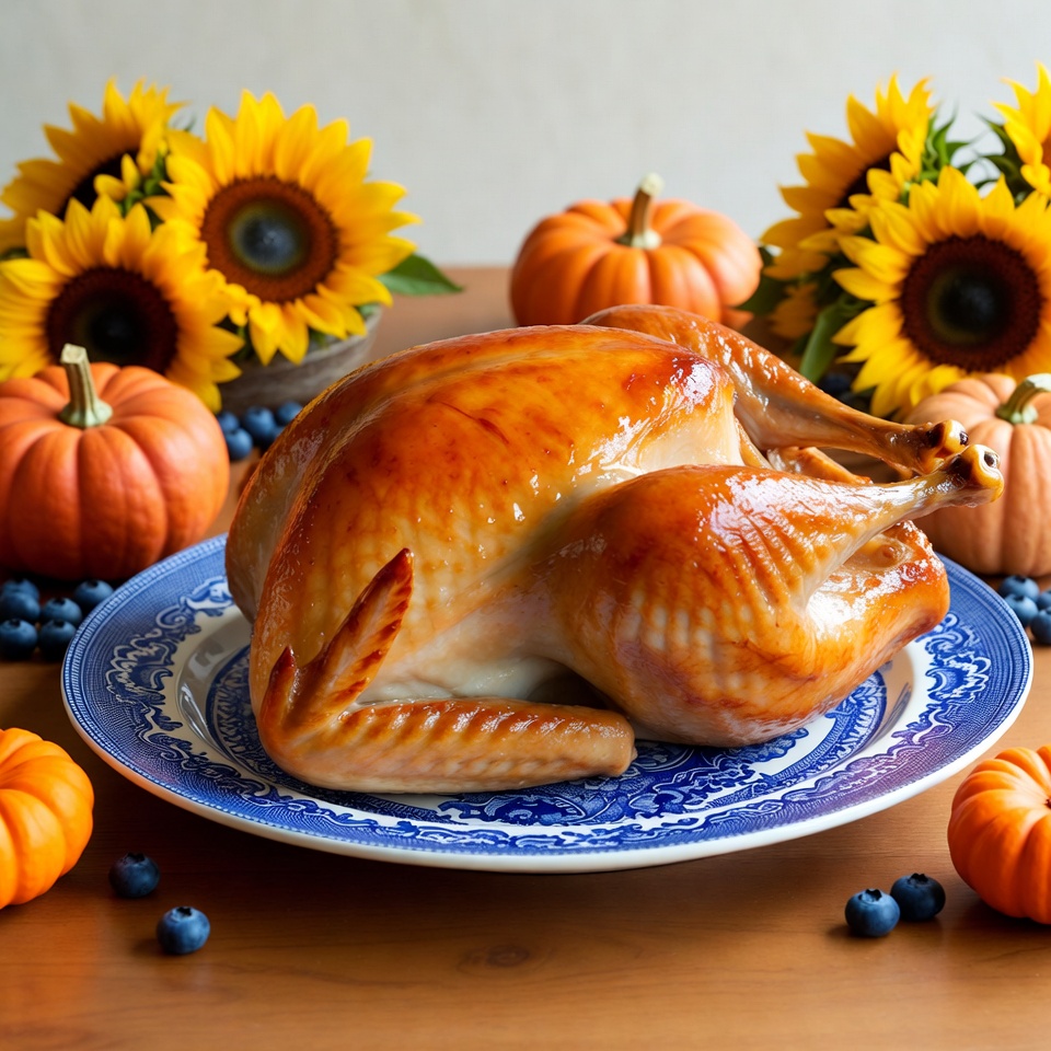 A golden roasted turkey is served on a blue plate surrounded by bright sunflowers, orange pumpkins, and blueberries. The turkey has glossy skin and is positioned on a wooden table with decorative fall elements. Additional pumpkins and berries are scattered around the platter.
