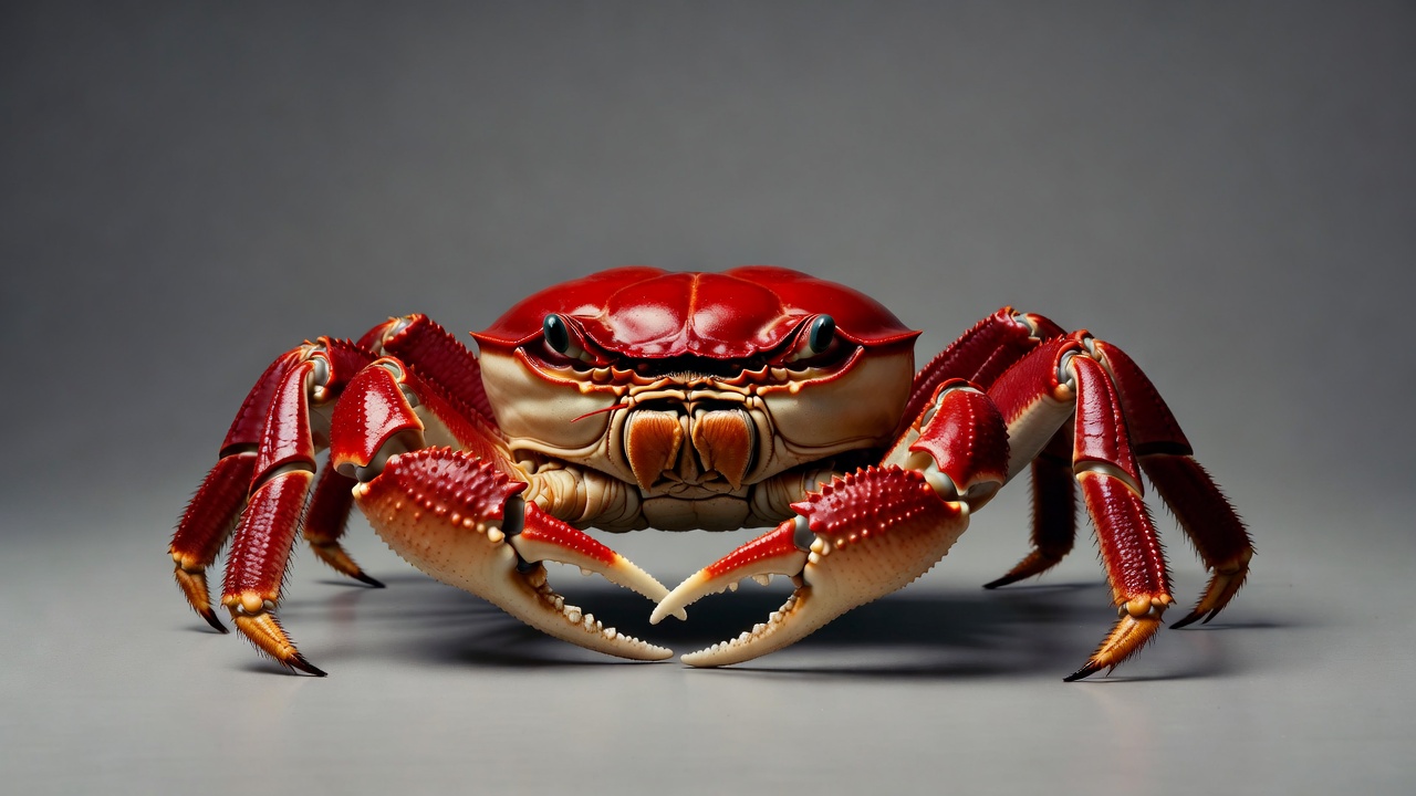 arthropod, claws, crab, crustacean, detailed shell, eyes, glossy texture, gray background, isolated, legs, marine animal, ocean creature, raised claws, shell, wildlife, red crab
