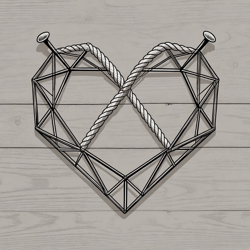 A geometric wireframe heart shape is formed with thick white rope crossed in an X pattern. Two large knitting needles pierce the top and bottom of the heart. The illustration is set against a light gray wooden plank background.