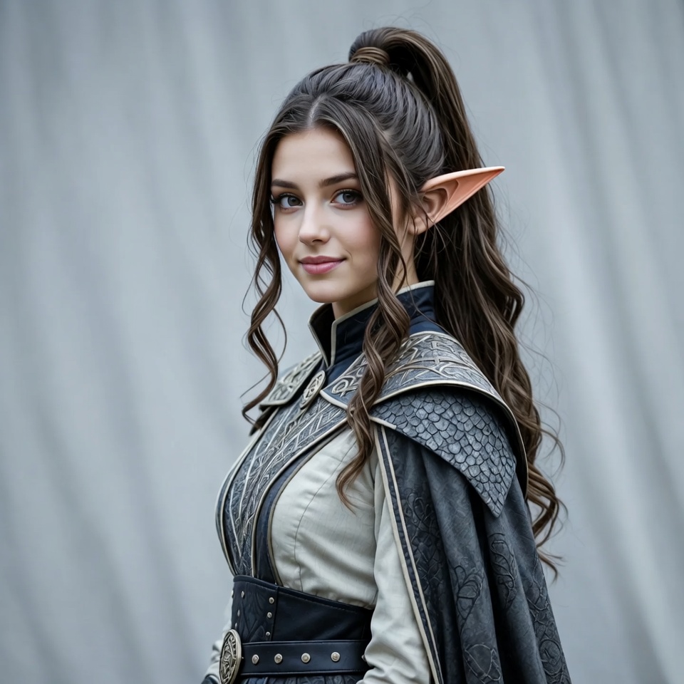 White, belt, cape, corset, cosplayer, dark armor, dark clothing, elegant pose, elf ears, fantasy character, fantasy cosplay, fantasy elf, female, gray background, high ponytail, intricate designs, long hair, medieval outfit, pointed ears, ponytail, portrait, roleplay costume, smiling woman, warrior elf, woman, elf woman