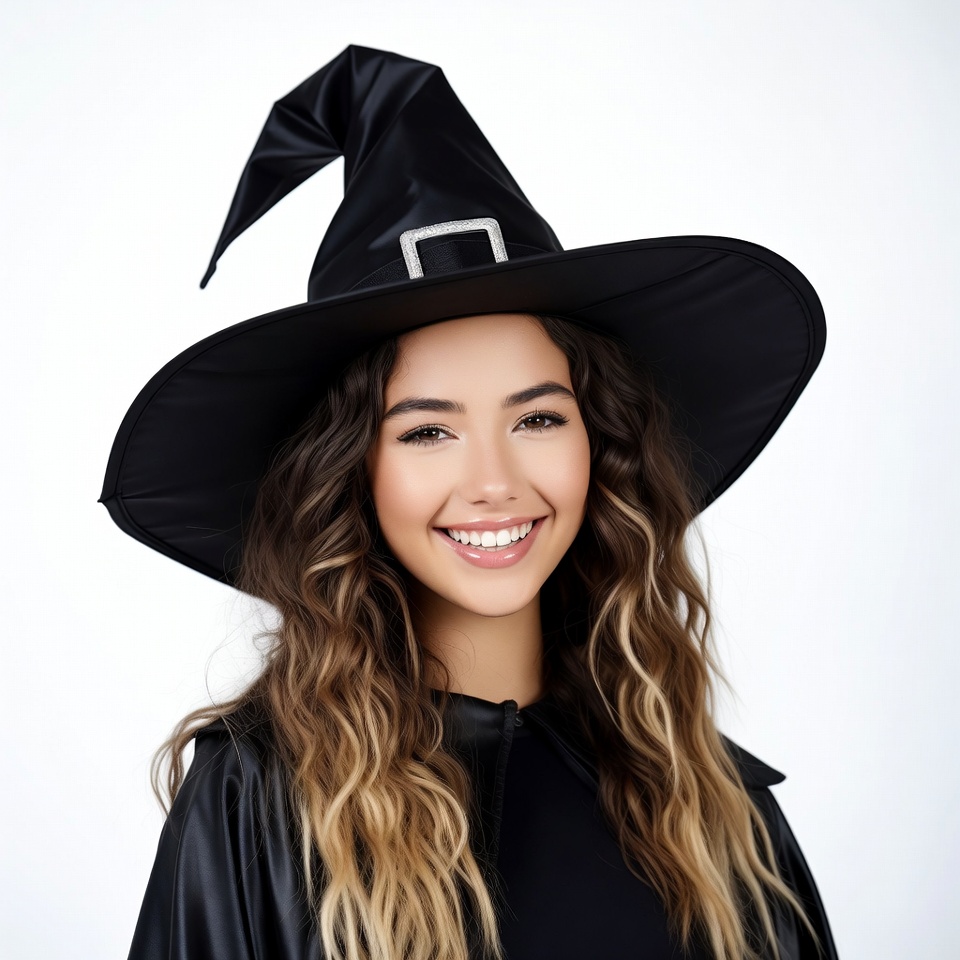 A young woman with wavy brown hair smiles at the camera while wearing a tall black witch hat with silver buckle. She is dressed in a black cape over dark clothing and stands against a white background. Her expression is cheerful and engaging.