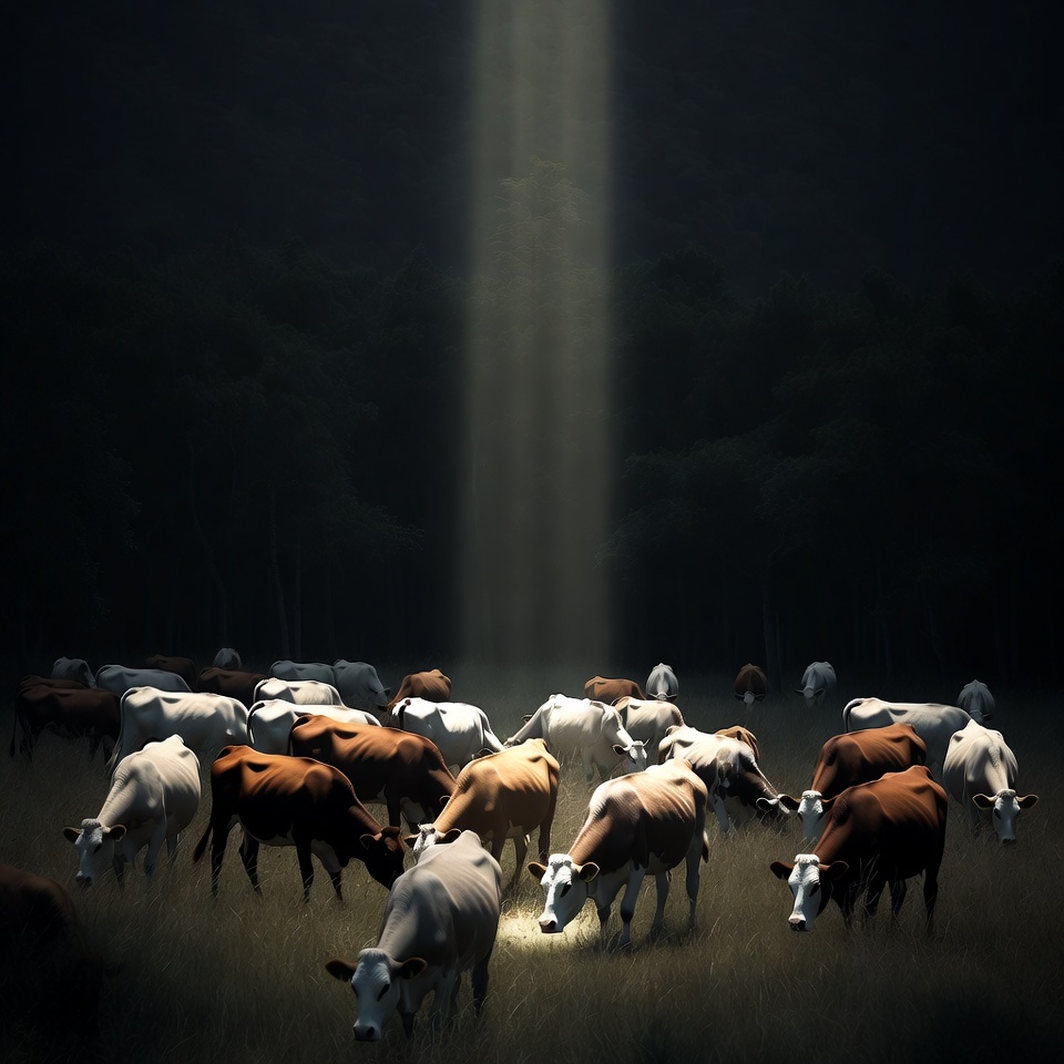 Holstein cows, animals, bovine, brown cows, cattle, dark background, divine light, farm animals, forest, grass, grazing area, group of cows, herd, light beam, mysterious light, night scene, ray of light, spotlight, standing cows, white cows, wildlife, woods, cows