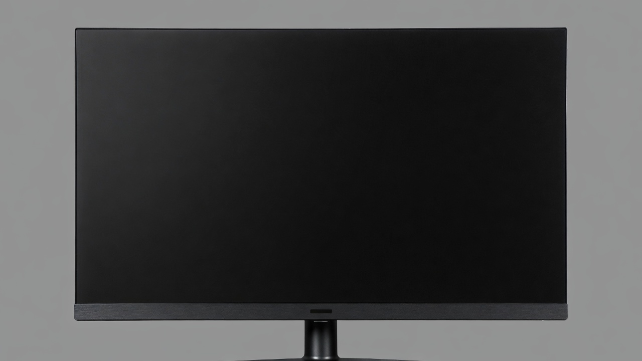 A sleek black flat-screen monitor with a thin bezel stands on a matching black stand. The screen is completely black and off, centered against a solid gray background. The monitor has a modern, minimalist design with subtle curves on the edges.