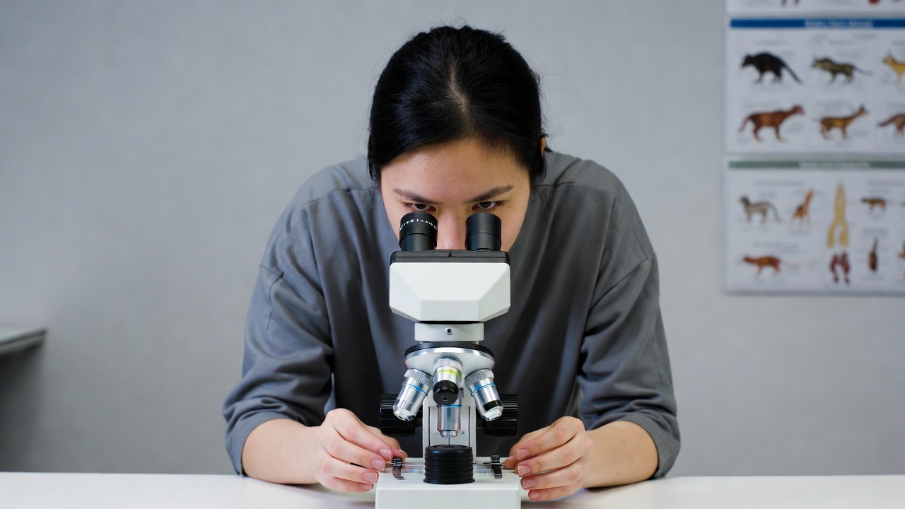 An Asian woman with straight black hair leans forward to peer into a microscope on a white lab table. She wears a gray sweater and is positioned in a laboratory setting with animal posters on the gray wall behind her. Her hands rest on the microscope stand as she focuses intently.