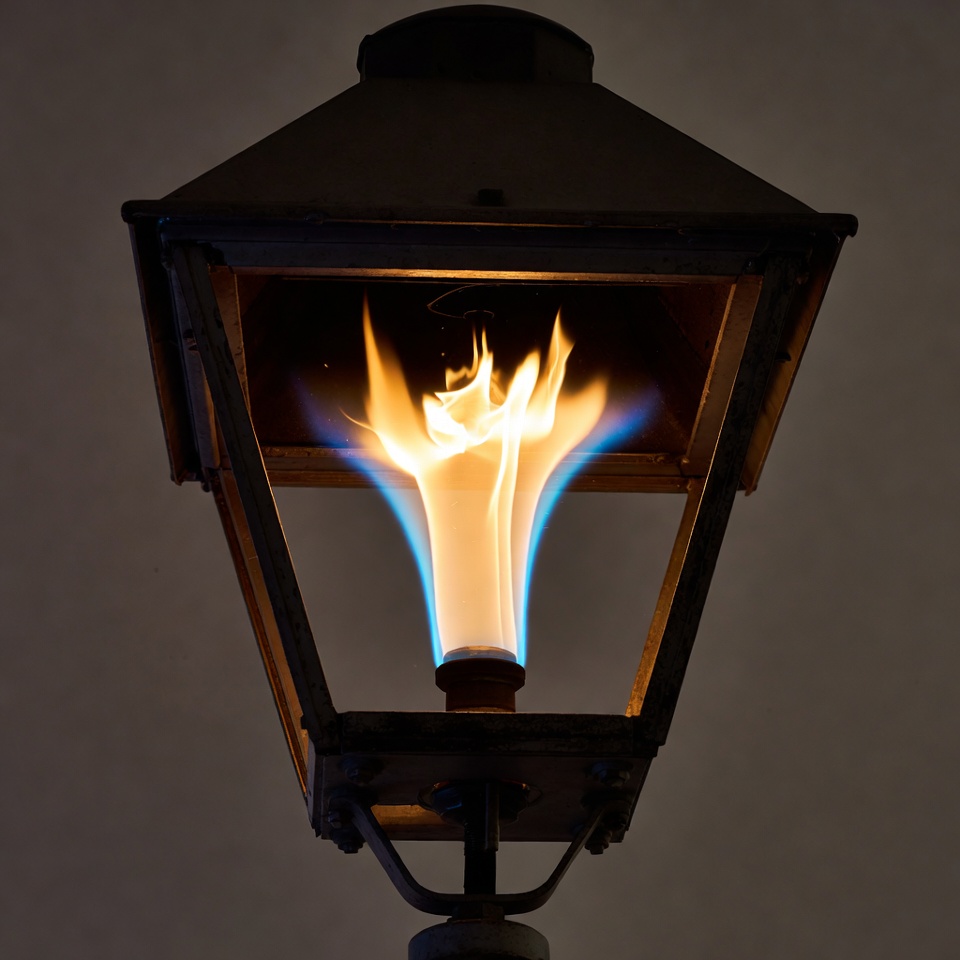 blue flame, burning flame, fire, flame, gas lamp, glass enclosure, isolated background, lantern, lit lamp, metal lamp, night light, outdoor lamp, vintage lamp, yellow flame, street lamp