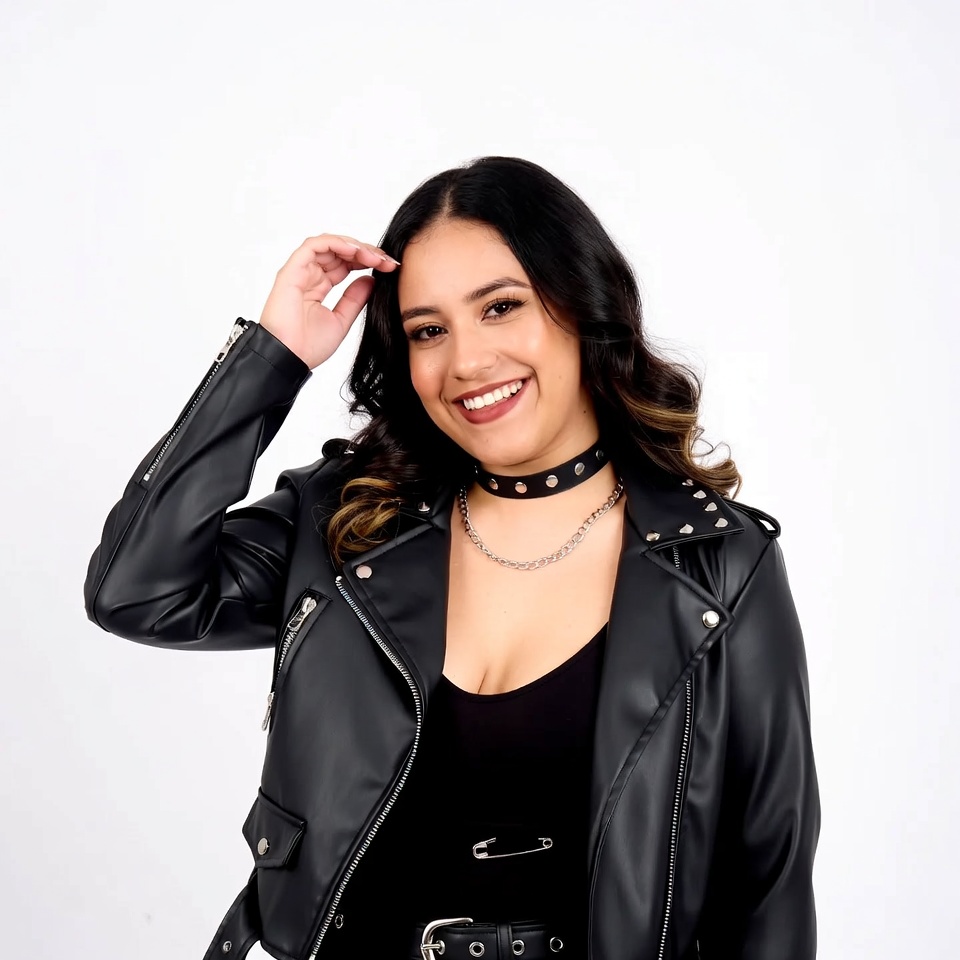 A young Latina woman with long wavy dark hair smiles broadly while touching her face with one hand. She wears a black leather biker jacket with silver studs, a spiked black choker necklace, a silver chain necklace, and a black top. She poses confidently against a plain white background.