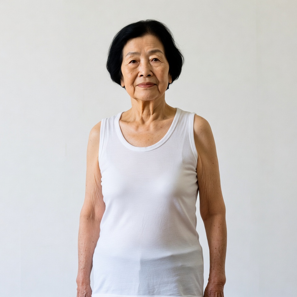 An elderly Asian woman with short black hair stands smiling against a plain white background. She wears a sleeveless white tank top that fits her slender frame. Her arms are relaxed at her sides and she has a gentle expression on her face.
