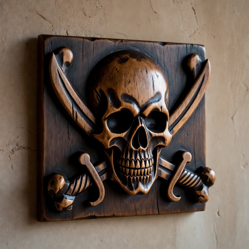 Wooden Carved Pirate Skull and Crossed Swords