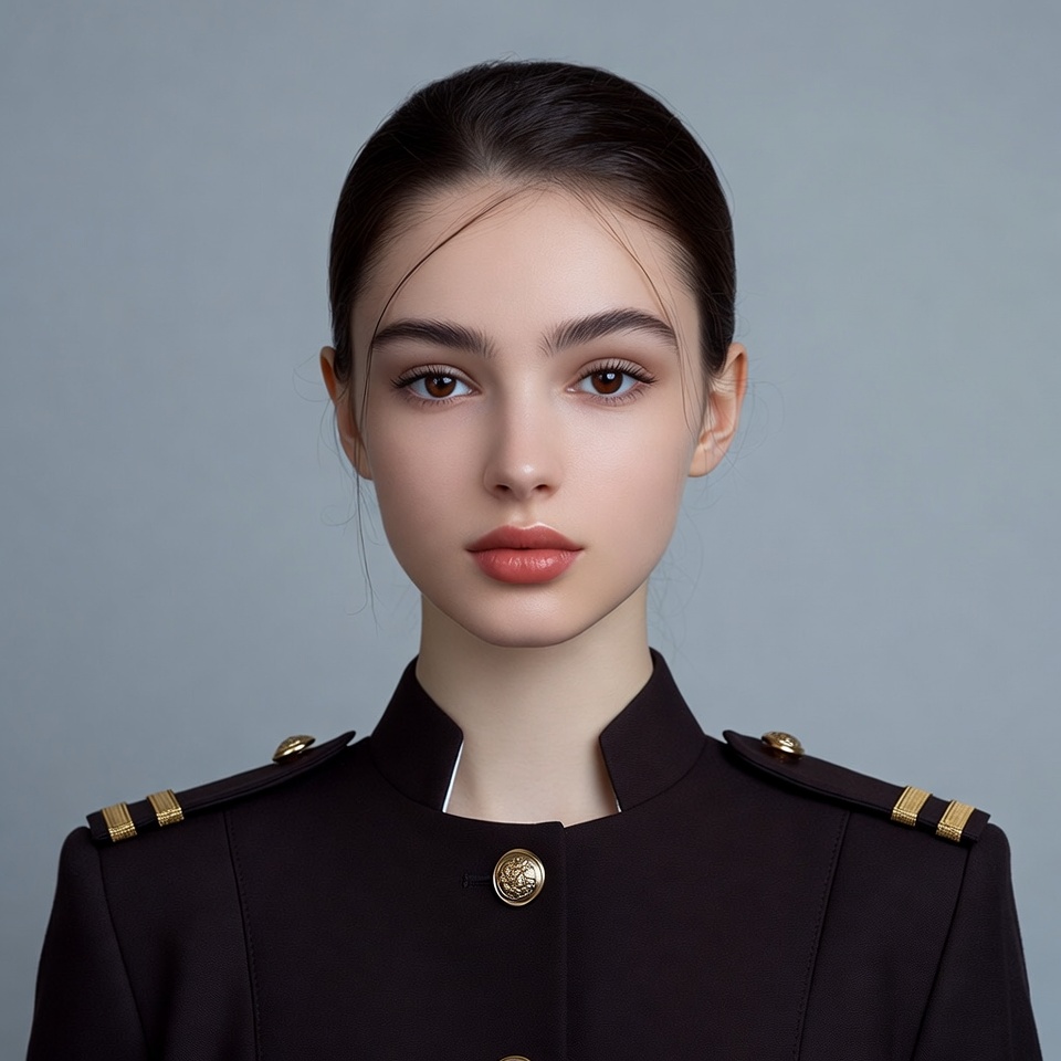 A young woman with dark hair in a sleek ponytail faces forward against a plain gray background. She has striking light-colored eyes, subtle makeup, and pink lipstick. She wears a dark navy military-style jacket with gold buttons and epaulets.