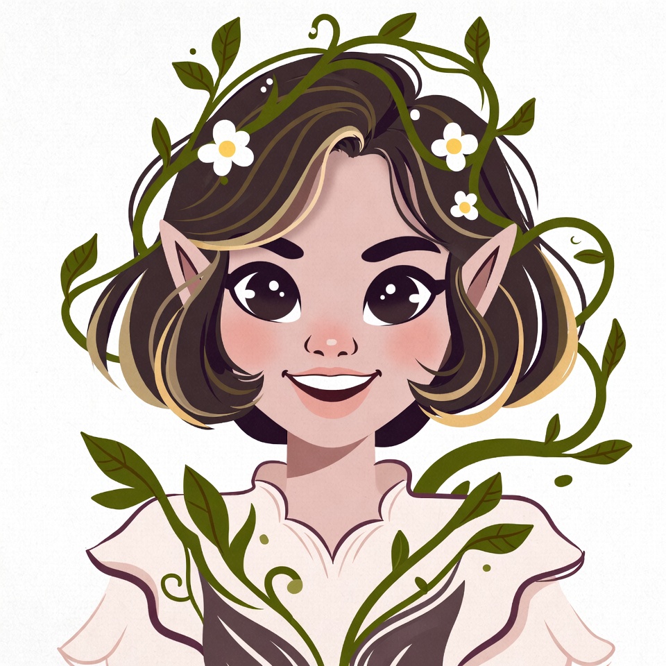 A cute illustrated elf girl with large expressive eyes and pointed ears smiles happily. Green vines and leaves wrap around her wavy brown hair adorned with white flowers. She wears a ruffled light-colored dress on a white background.