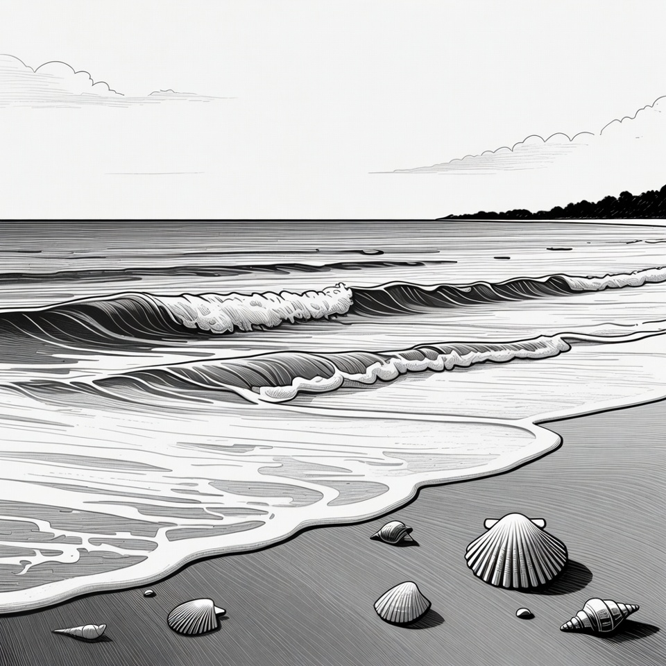 A black and white line art illustration depicts gentle ocean waves crashing onto a sandy beach scattered with seashells. Several seashells, including scallops, lie on the wet sand near the water's edge. The scene includes distant trees and cloudy skies.