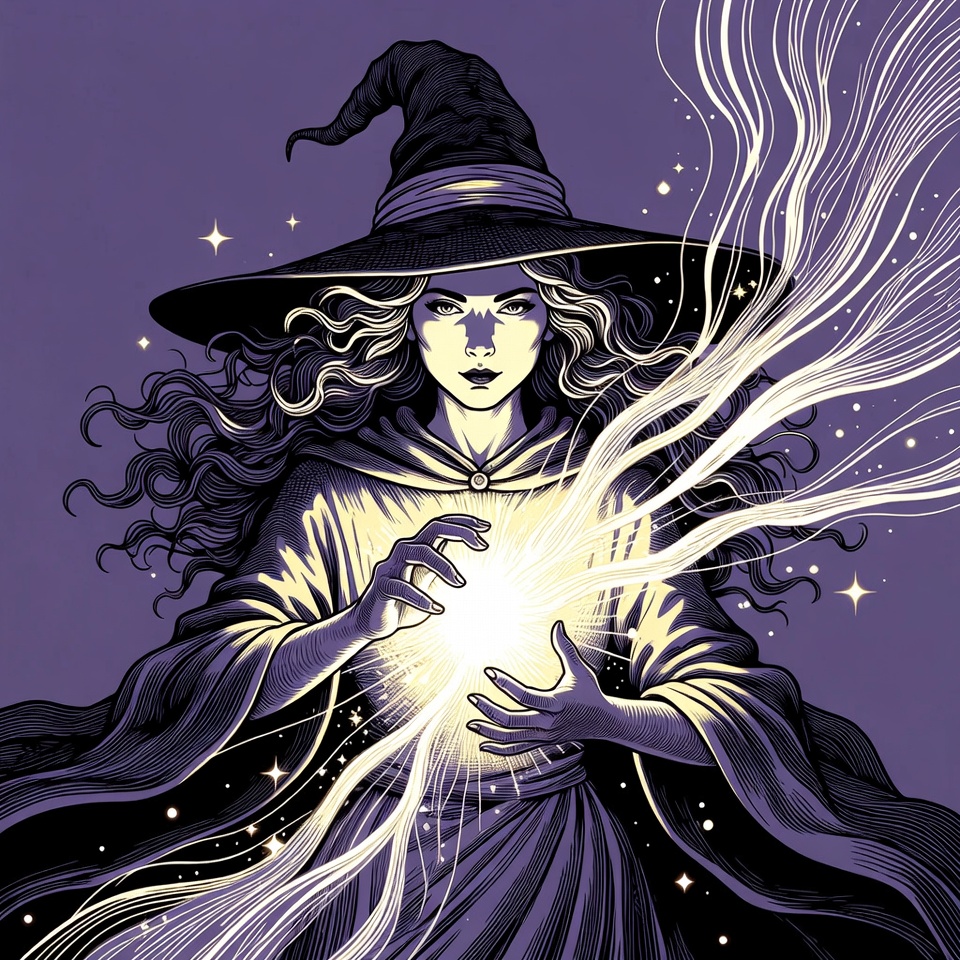 An illustrated witch with long wavy blonde hair wears a black pointed hat and flowing robe. She holds her hands together, conjuring a glowing orb of white magical energy with sparkling streams emanating outward. The scene features a dark purple background with ethereal light effects.