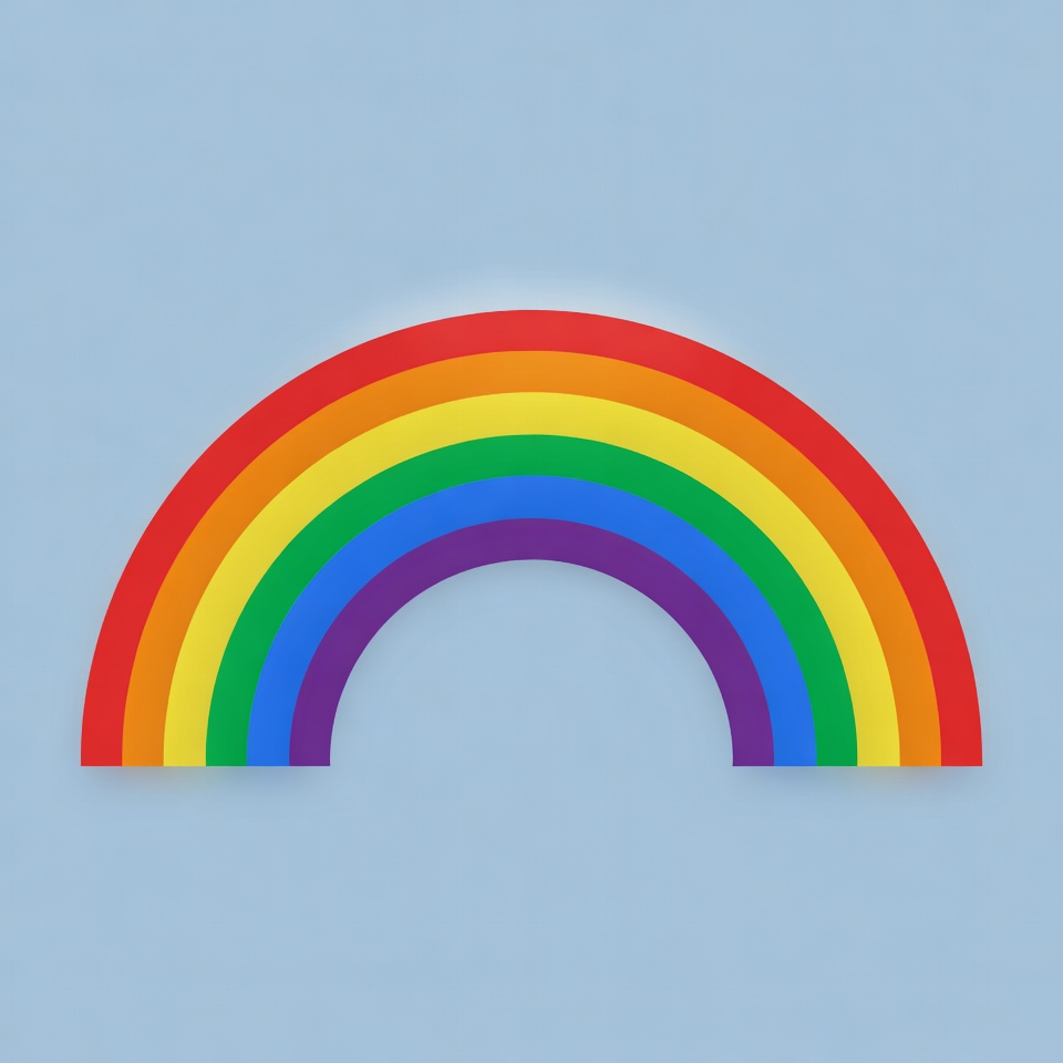 A vibrant rainbow arcs across a solid light blue background. It displays the classic seven colors: red, orange, yellow, green, blue, indigo, and violet. The illustration has a smooth, 3D-like appearance with clean edges.
