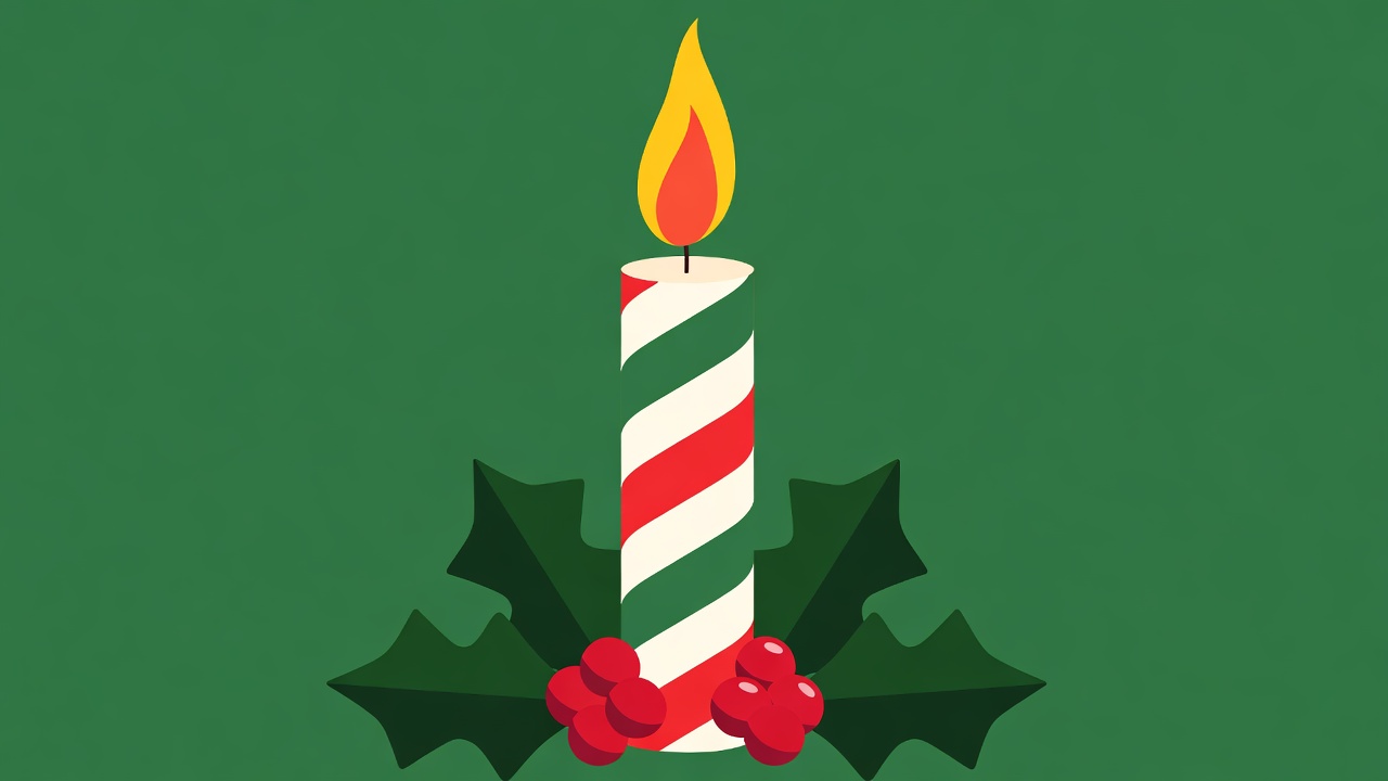 A clipart illustration features a red and white striped candy cane-shaped candle with a yellow flame on top. It is centered on a green background and surrounded by green holly leaves and red berries. The festive design is simple and bold with flat colors.