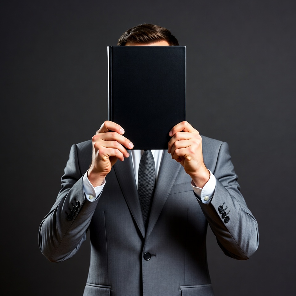 A man in a gray suit and tie holds a large black book in front of his face, completely hiding it. He stands against a dark gray background with his hands gripping the book firmly. His suit jacket features a white shirt and cufflinks.