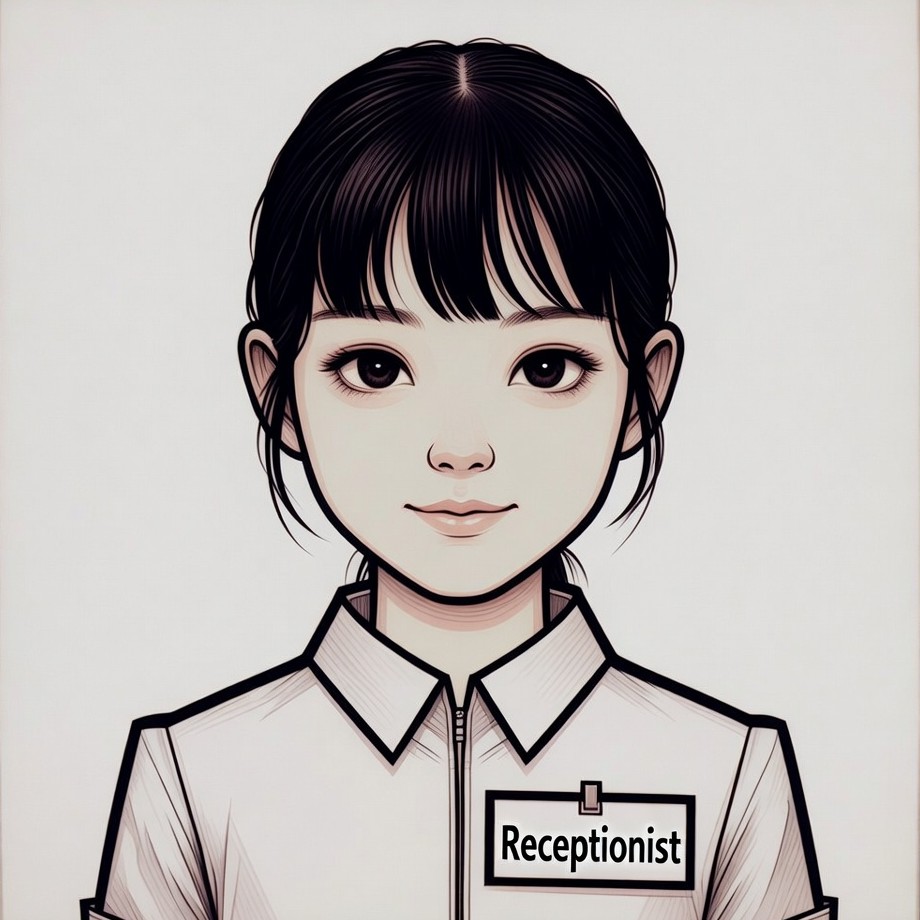 An anime-style illustration of a young Asian woman with straight black hair and large expressive eyes. She wears a white collared uniform shirt with a name tag labeled 'Receptionist'. The portrait is on a plain white background.