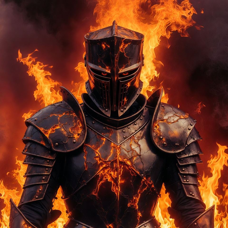 A menacing knight wears black armor with glowing cracks and stands against a swirling background of intense orange flames and dark smoke. The full-face helmet features red glowing eyes, and the armor shows fiery fissures throughout. The dramatic scene emphasizes the knight's imposing armored pose amid the inferno.