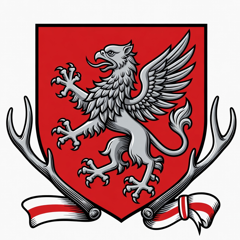 antlers, badge, claws, coat of arms, crest, eagle head, emblem, fantasy animal, griffin, heraldic shield, heraldry, illustration, isolated background, lion body, mythical creature, red shield, ribbon scroll, silver gryphon, symbol, vector art, wings, gryphon