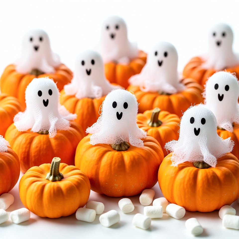 Multiple white fabric ghosts with smiling faces sit atop small orange pumpkins. Scattered white marshmallows surround the pumpkins on a white background. The arrangement features a playful Halloween theme with cute ghost decorations.
